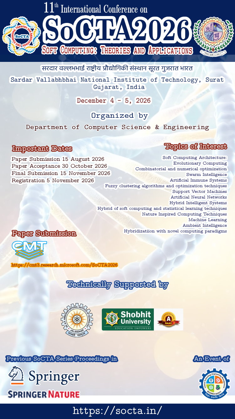 The International Conference on Soft Computing: Theories and Applications, SoCTA2026 is a major annual international conference to bring together researchers, engineers, developers and practitioners from academia and industry working in all interdisciplinary areas of soft computing to share their experience, and exchange and cross-fertilize their ideas.